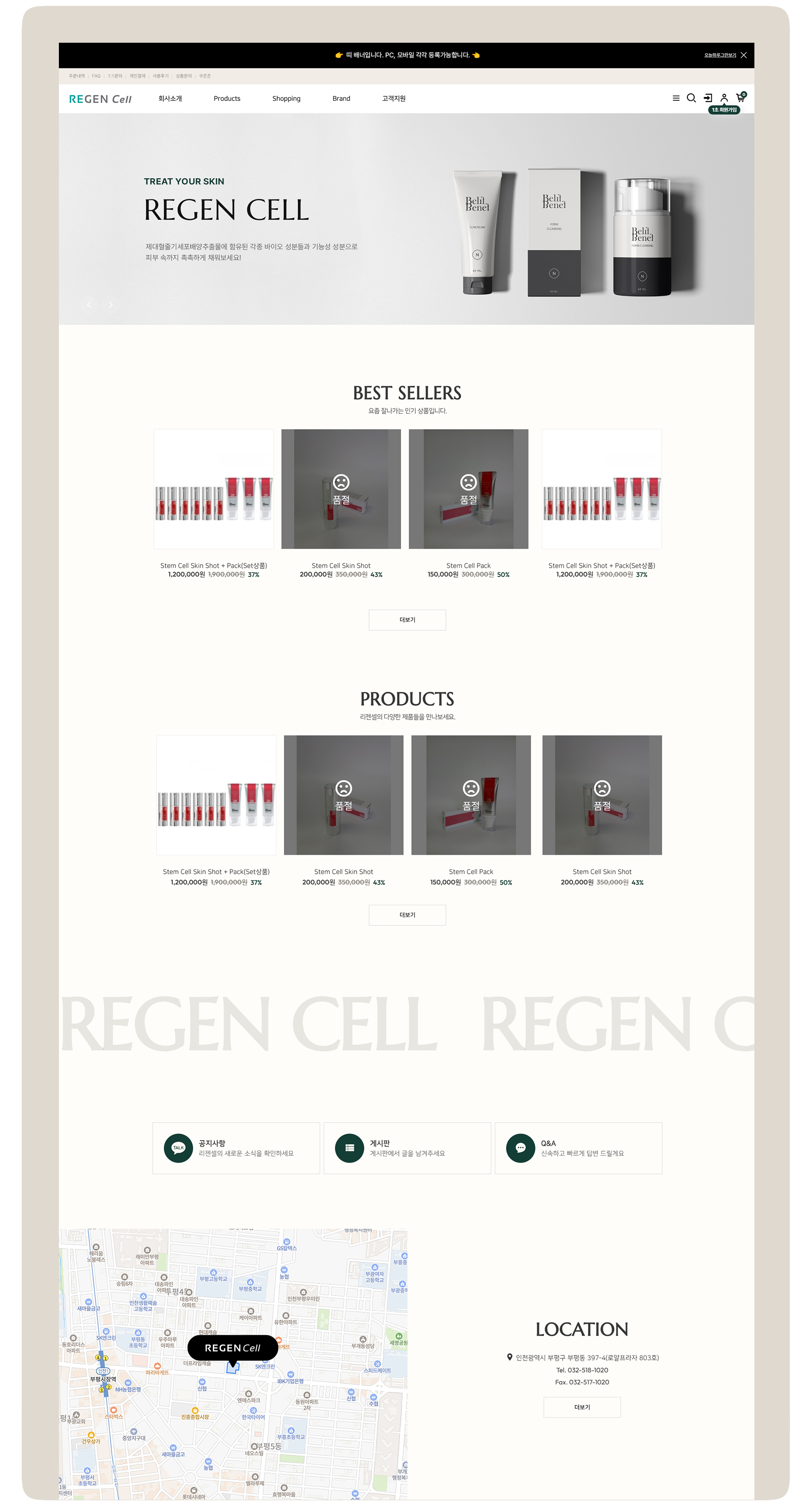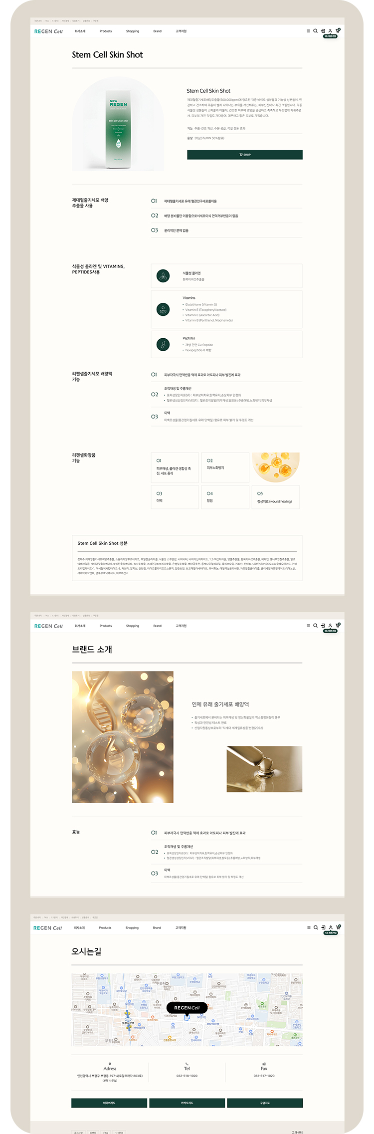 리젠셀은 STeMIN을 원료를 기반으로 한 줄기세포 전문 화장품 기업으로, 브랜드 아이덴티티를 명확하게 인식할 수 있도록 설계된 웹사이트입니다. 또한 제품 정보와 구매를 동시에 전달할 수 있도록 구성되어 있습니다.