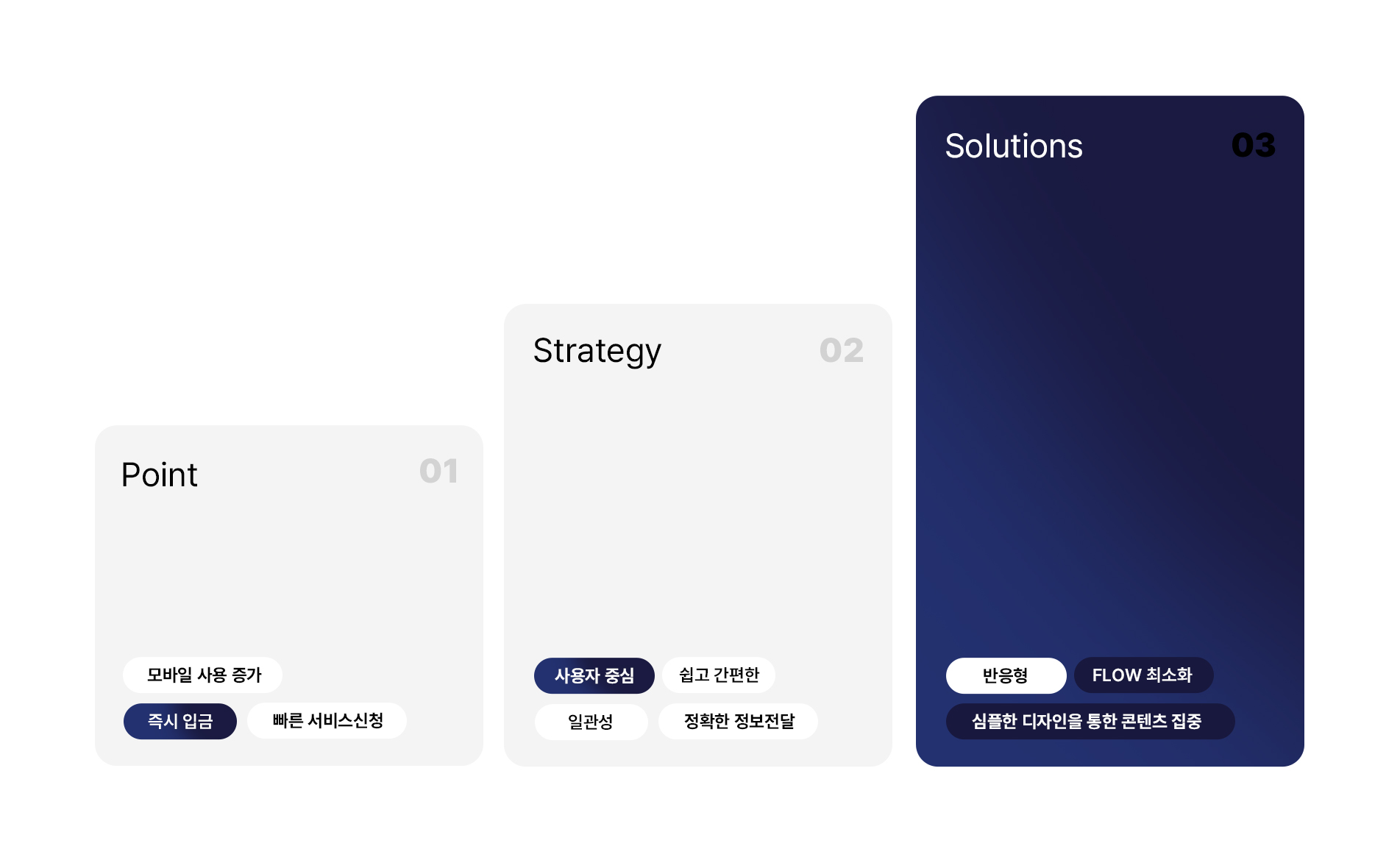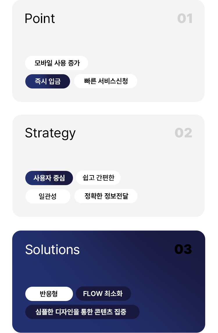 '모바일 사용 증가', '즉시 입금', '빠른 서비스 신청' 세 가지 핵심점을 중심으로