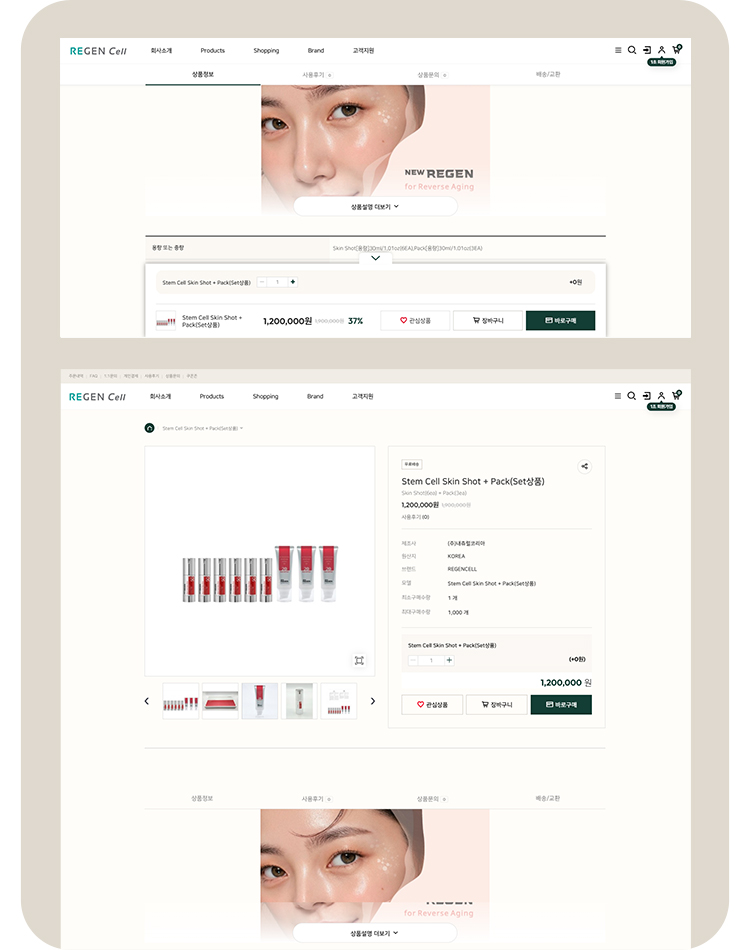 줄기세포 원료 기반 화장품 전문 기업인 리젠셀의 브랜드 아이덴티티를 명확히 전달하고, 동시에 제품 정보 제공과 간편한 구매 경험을 지원하는 것을 목표로 합니다. 이를 통해 방문자는 기업과 제품의 가치를 직관적으로 이해하고, 신뢰성 있는 쇼핑 환경에서 만족스러운 경험을 얻을 수 있도록 합니다.